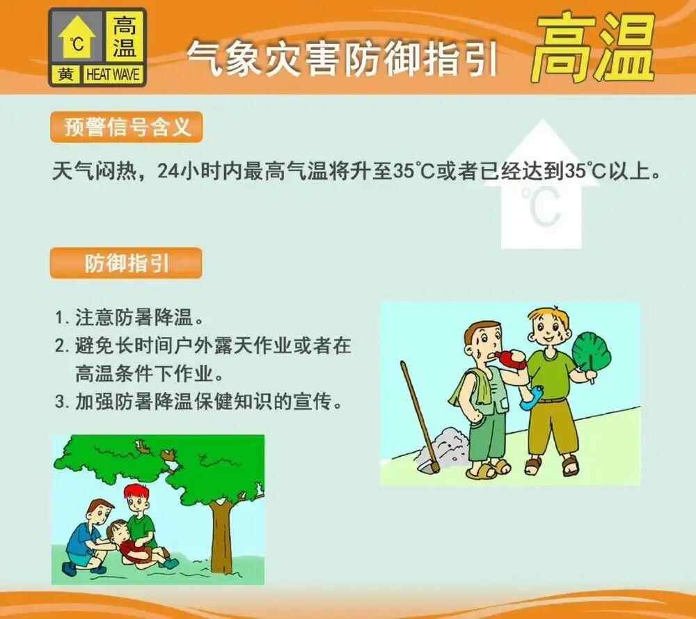 基于上述医学结论,我国各地气象部门自上世纪起陆续实施的高温预警信号,大多以35℃作为发布指标气温。在广东,高温黄色预警信号的含义,设定为“天气闷热,24小时内最高气温将升至35℃或者已经达到35℃以上。为了缓解人体因“散热指令”而出现的身体变化,广东省气象部门制定的高温黄色预警信号防御指引中,提醒人们注意防暑降温,避免长时间户外露天作业或者在高温条件下作业,加强防暑降温保健知识宣传。