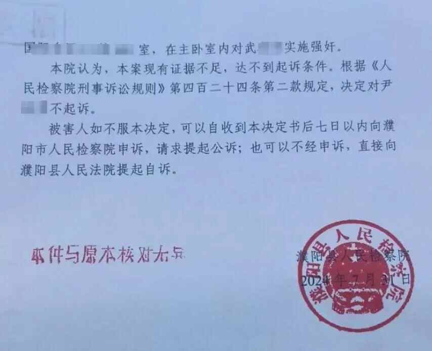 因涉嫌强奸罪,2023年8月18日,尹某被河南濮阳县公安局刑事拘留,同年9月1日经当地检察机关批准,河南濮阳县警方以涉嫌强奸罪逮捕尹某,而报警人是尹某妻子武某。在被羁押280余天后,濮阳县人民检察院认为该案现有证据不足,达不到起诉条件,于2024年7月31日对尹某作出不起诉决定。