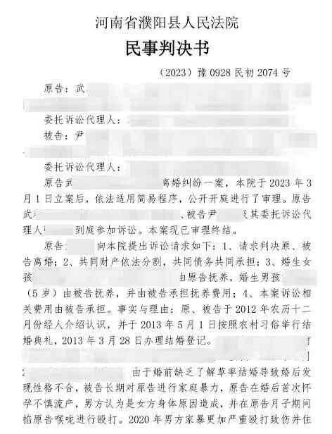 据悉,在武某报警之后,尹某被行政拘留三天,夫妻就此分居,开始准备离婚事宜。2023年3月1日,濮阳县人民法院就原告武某诉被告尹某离婚纠纷一案立案进行公开审理。判决书显示,武某在诉讼请求中称,婚后发现与丈夫尹某性格不合,且尹某长期对她进行家庭暴力。