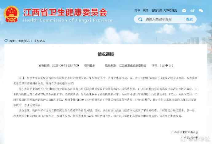 6月18日,江西省卫生健康委员会“救护车跨省转运收费2.8万元”事件的情况通报。