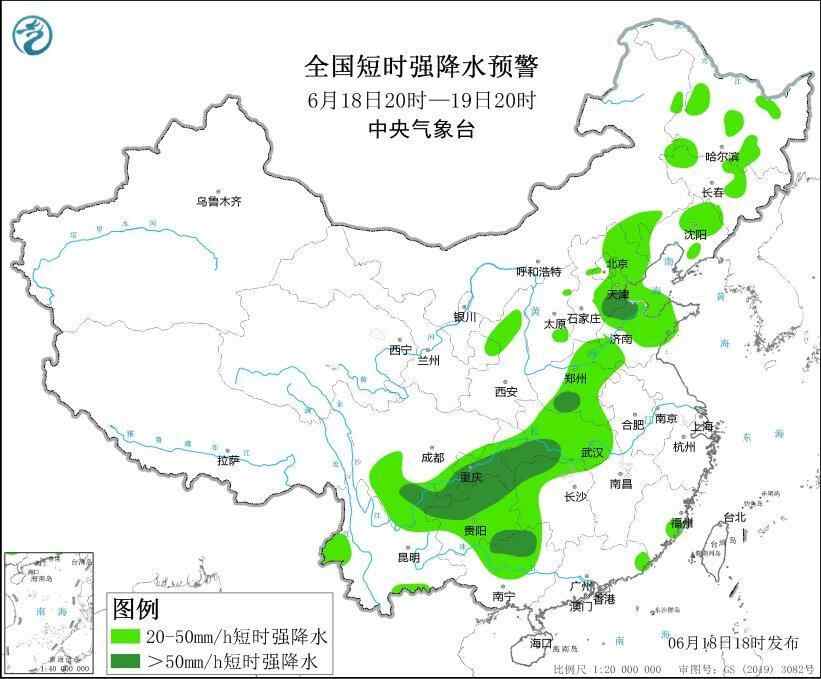 预计,6月18日20时至19日20时,贵州、四川南部和东部、重庆、广西北部、湖北、湖南西部和北部、河南中东部以及河北东部和南部、山东中西部、天津南部、辽宁北部等地部分地区有大到暴雨,其中,河南中部、湖北西南部、湖南西北部、贵州中北部等地部分地区有大暴雨(100~180毫米)。上述部分地区伴有短时强降水(最大小时降雨量20~50毫米,局地可超过80毫米),局地有雷暴大风等强对流天气。