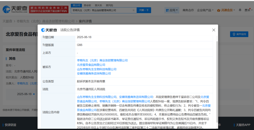 天眼查App显示,近日,北京市通州区人民法院向山东枣粮先生生物科技有限公司、安徽珠雅商务咨询有限公司公告送达易烊千玺与上述两公司及北京爱吾食品有限公司、枣粮先生(北京)商业连锁管理有限公司的人格权纠纷案起诉状副本、开庭传票等材料,并定于8月18日开庭审理。