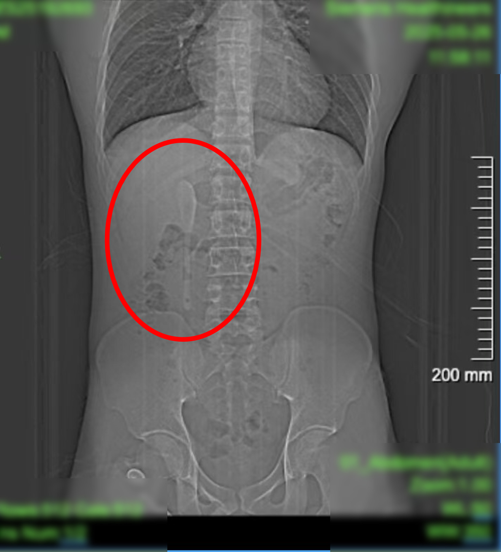 CT显示,这支近15厘米长勺状物体,严丝合缝地横亘于十二指肠球部与降部交界的生理狭窄处,稍有不慎即可能刺穿肠壁,引发腹膜炎或大出血。