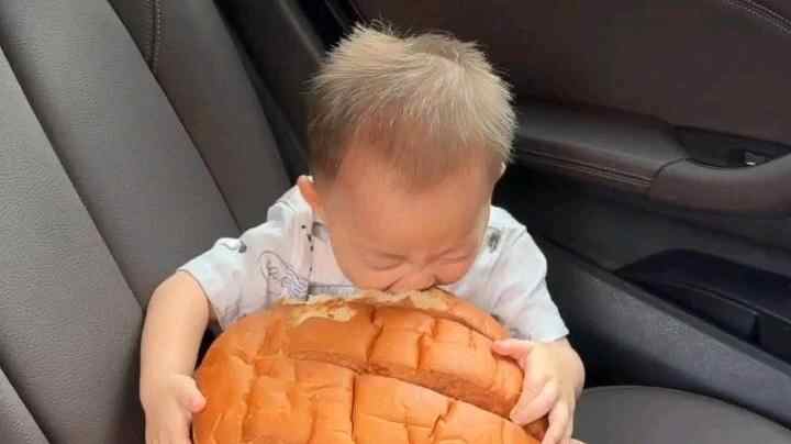 第一眼还以为是抱枕!小孩哥狂炫脸盆大的面包 网友:饿了啃两口,困了当枕头 #小羊拍客
