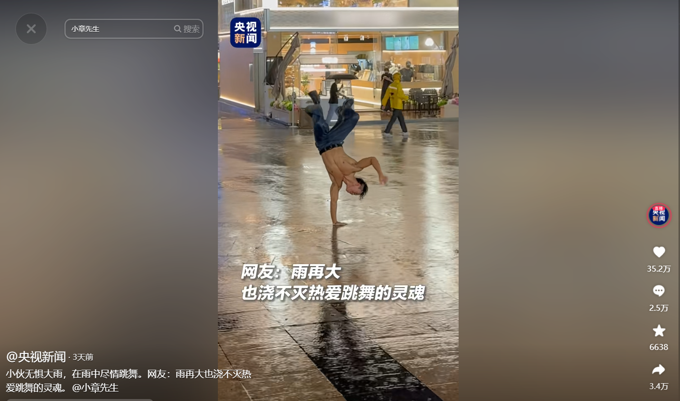 6月17日,广东深圳龙华下起了暴雨,一名小伙在雨中即兴跳舞,高难度舞蹈动作配合雨水飞溅,吸引路人驻足。视频拍摄后被央视转发,播放量超百万,点赞已超30万。