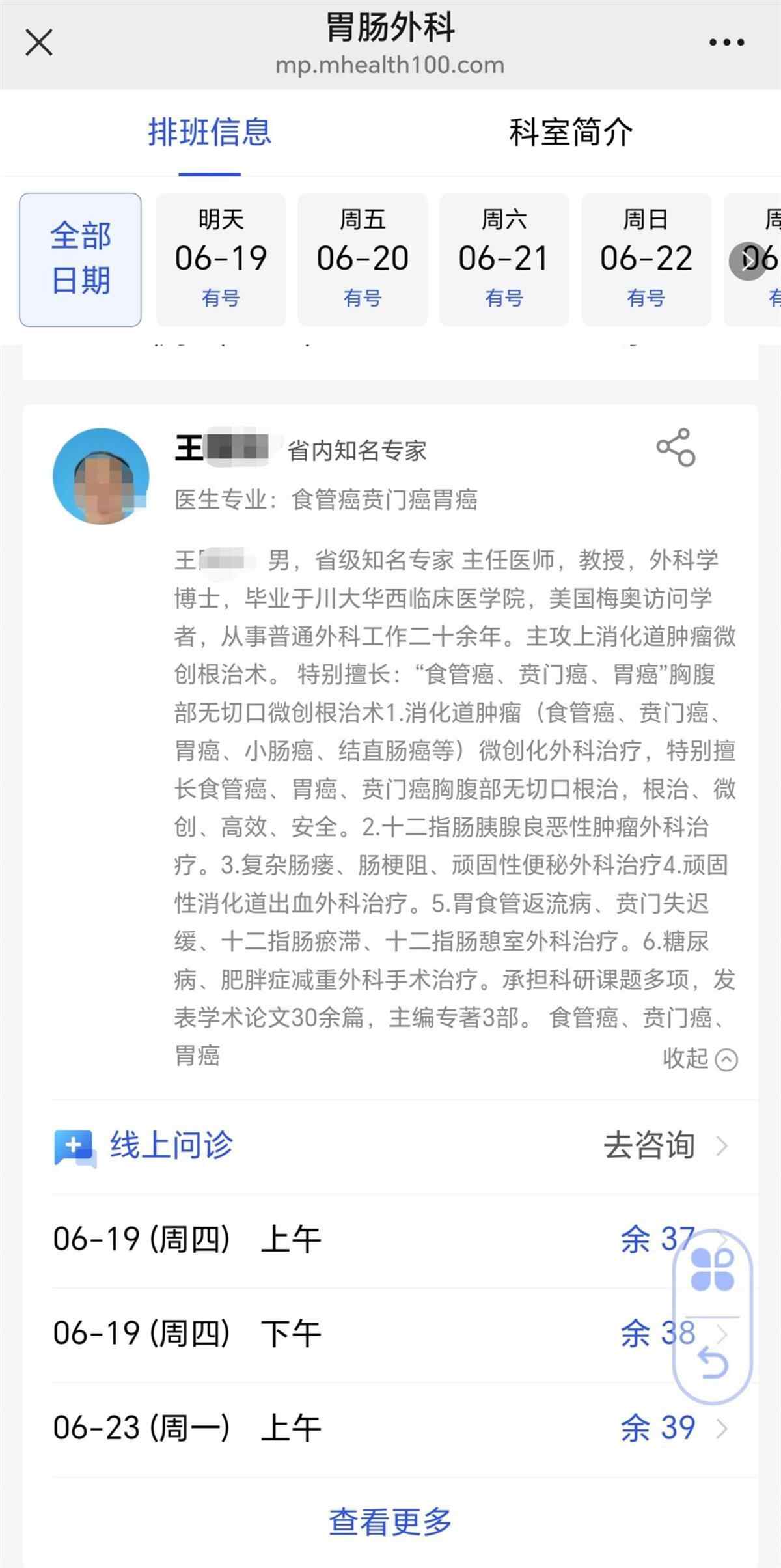 6月18日,极目新闻记者查询郑州大学第一附属医院微信公众号发现,进入预约挂号界面后,选择该院河西园区的胃结直肠外科医学部,胃肠外科的排班信息里,上述事件涉事的王某俊医生目前可以挂号,其中6月19日(周四)上午、下午均有30多个余号。