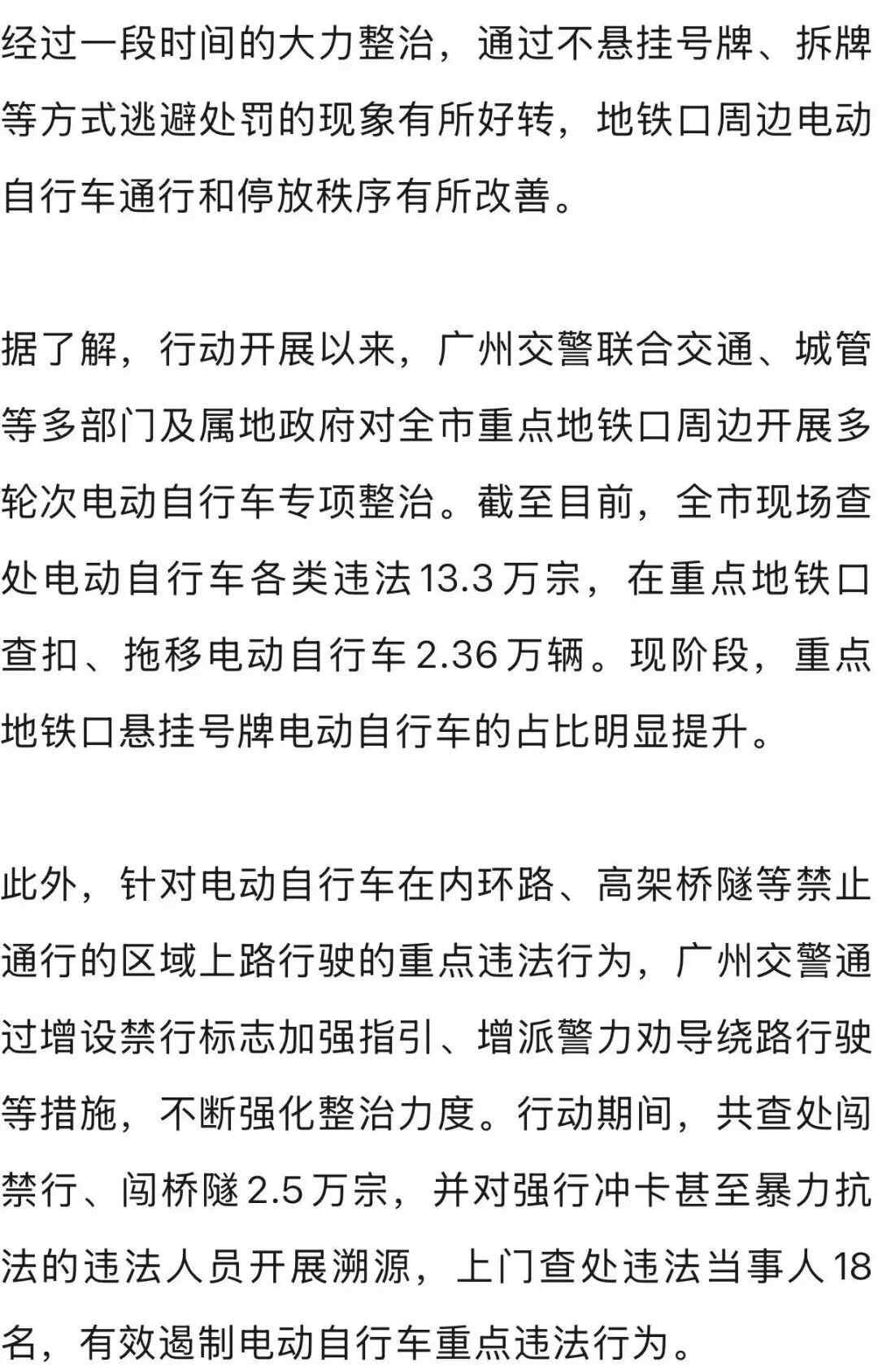 6月19日,记者从交警部门获悉,自5月26日广州市开展无牌电动自行车专项整治行动以来,全市在重点地铁口周边掀起教育劝导、执法处罚、宣传警示浪潮。截至目前,全市现场查处电动自行车各类违法13.3万宗,在重点地铁口查扣、拖移电动自行车2.36万辆。