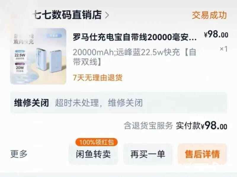 根据该消费者发布的内容,他在电商平台一家名为“七七数码直销店”的店铺内购买了一台2万毫安的罗马仕充电宝,实付款98元。6月18日晚,南都·湾财社记者在电商平台查询该店铺发现,该店铺已经没有上架任何商品,记者向店铺客服发送信息,客服也已读不回。