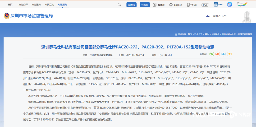 据深圳市市场监管局6月16日发布的公告,日前,罗马仕按照相关要求召回2023年6月5日-2024年7月31日期间制造的部分移动电源,召回三款型号共计超49万台充电宝。罗马仕方面表示,本次召回的移动电源产品,由于部分电芯原材料来料原因,极少数产品在使用过程中可能存在过热现象,在极端场景下可能产生燃烧风险,存在安全隐患。