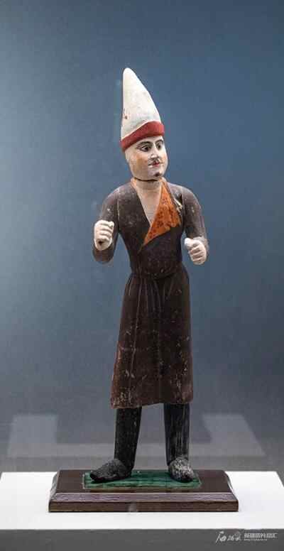 这件来自阿斯塔那古墓群的木俑,模样极具辨识度,55.8 厘米的 “傲人身高”,加上深邃眼窝、高挺鼻梁,再配上微微上翘的胡须、尖顶毡帽与翻领长袍,活脱脱一个从古代穿越而来的“丝路物流师”。