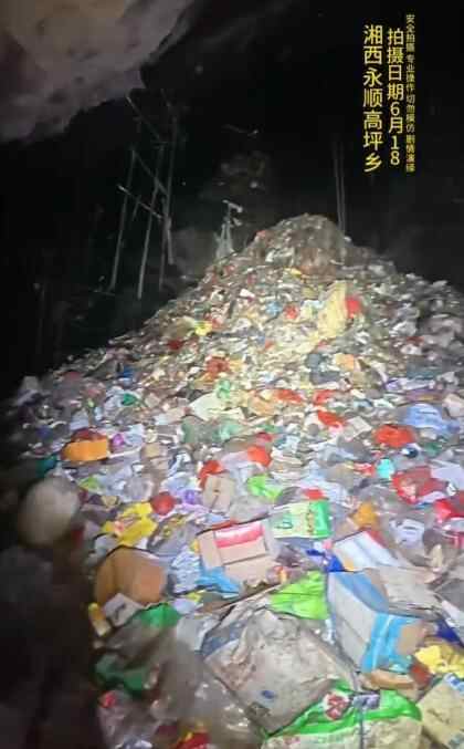 6月18日,有博主发布视频称,湖南湘西永顺县高坪乡境内一处溶洞内遍布垃圾,并且已经形成了目测15米高的“垃圾山”,地下水疑似遭到了污染。该博主此前曾曝光张家界市慈利县溶洞垃圾事件。