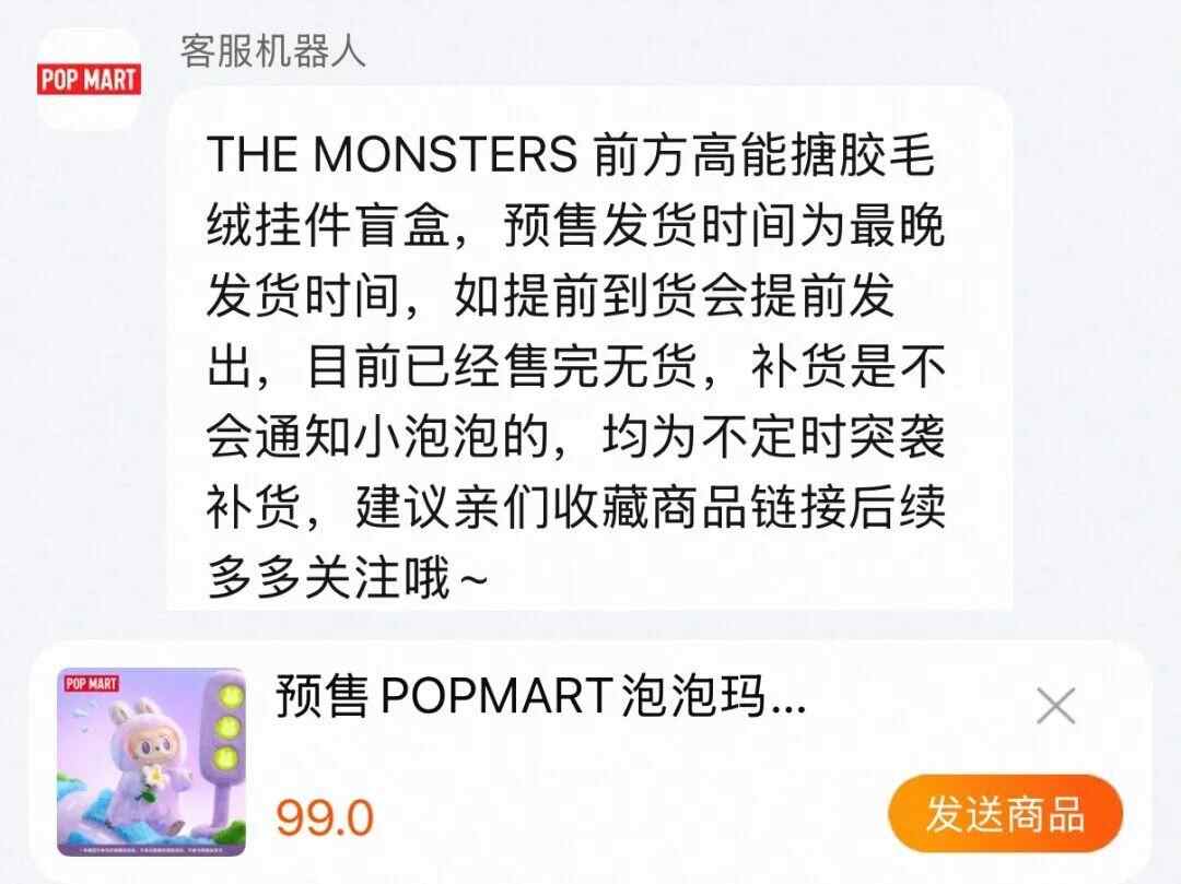 目前,仅天猫泡泡玛特旗舰店渠道,该系列销量已超过70万,链接已下架,客服表示目前已经售完无货,并且补货均为“不定时突袭补货”。