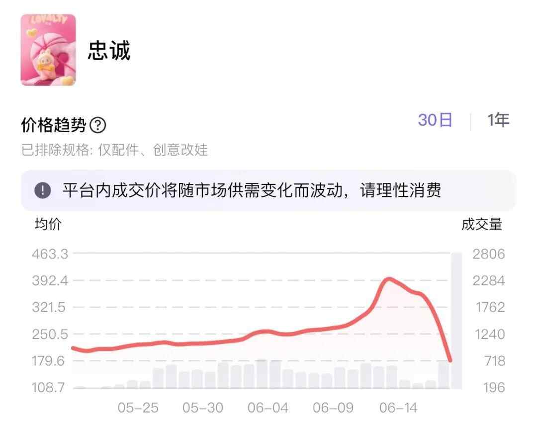 根据某潮玩二手交易软件的数据,该系列盲盒价格普遍下跌约50%。以该系列普通款“忠诚”LABUBU为例,其6月13日的成交均价为418.6元,而到6月18日,均价已跌至153.9元。记者今日(6月19日)查询发现,该款LABUBU的出售价已降至120元左右。