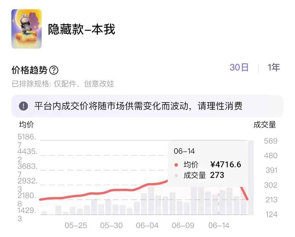 系列中最受追捧的隐藏款“本我”在二级市场的价格也大幅跳水。其成交均价从6月15日的4621元,骤降至6月18日的1921.4元。该二手交易平台软件对该系列盲盒已经发出提示:“受官方补货影响,价格可能存在明显波动,请理性消费。”