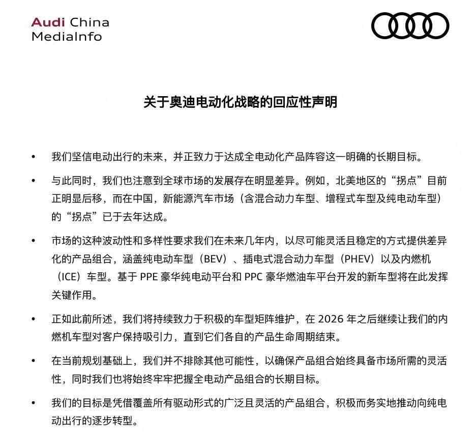 奥迪声明认为,在当前规划基础上,并不排除其他可能性,以确保产品组合始终具备市场所需的灵活性,目标是凭借覆盖所有驱动形式的广泛且灵活的产品组合,积极而务实地推动向纯电动出行的逐步转型。