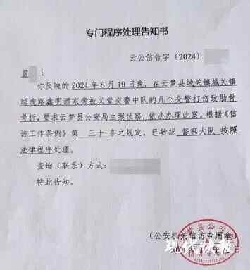 6月17日,湖北孝感市民曾先生反映,2024年8月19日晚,他无证驾驶一辆摩托车,在经过云梦交警大队义堂中队设立的酒驾查验点位时被查处。查处过程中,曾先生因辱骂了交警,随后被多名交警殴打。后经鉴定,曾先生9根肋骨骨折,构成十级伤残,他认为这属于刑事案件,但湖北省孝感市云梦县公安局未对此立案。