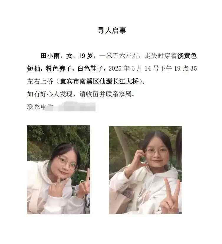 6月14日晚,四川宜宾19岁的大一女生田小雨在长江大桥附近失联,至今已近5天,超110个小时。