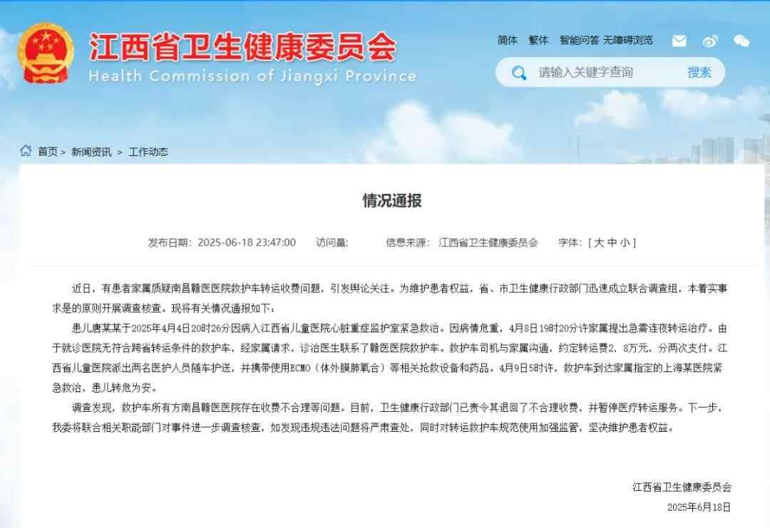 6月18日晚,江西省卫生健康委发布情况通报称,调查发现救护车所有方存在收费不合理等问题,已责令其退回了不合理收费,并暂停医疗转运服务。通报中提到,唐先生选择私营救护车的原因,系就诊医院没有符合跨省转运条件的救护车。