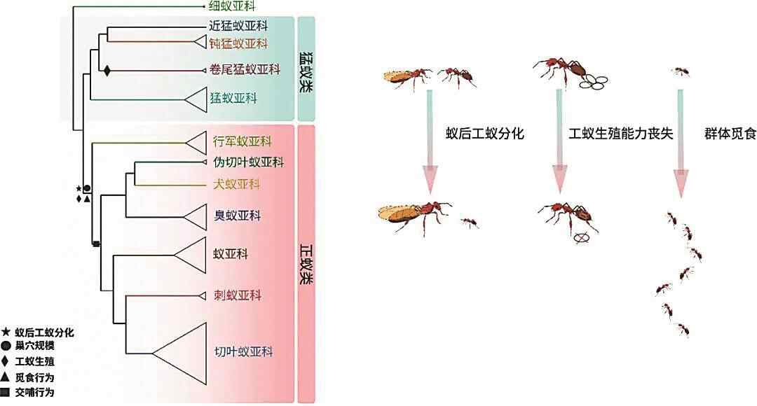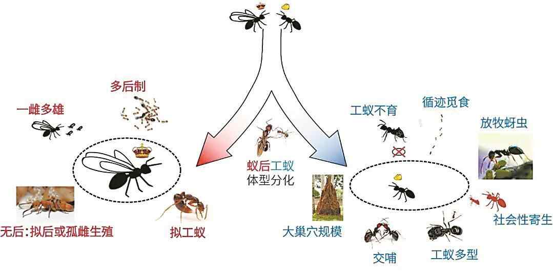 蚂蚁社会的复杂组织结构来源于多个表型性状与生活史特征之间的相互作用。研究发现,决定蚂蚁社会性的两个关键因素是巢穴的群体规模,以及蚁后与工蚁之间的分化程度。这两者为其他社会性状的演化(如工蚁的体型差异、生殖能力的丧失等)奠定了基础。