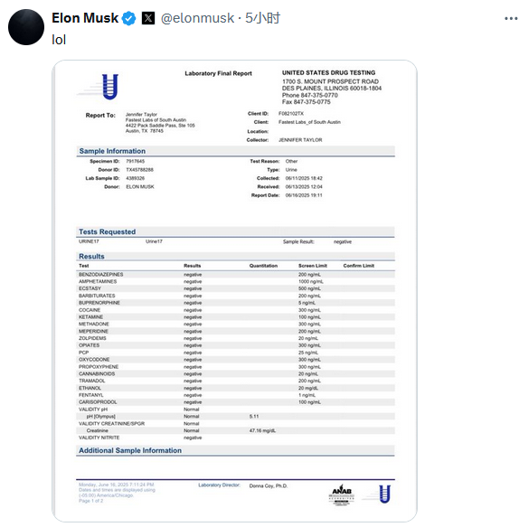 报道称,马斯克17日在社交平台X上发布了6月13日向一家医学实验室提交的尿液样本检测结果。报告显示其尿检结果为阴性,未检测出包括氯胺酮、摇头丸、大麻、可卡因等在内的任何违禁药物,所有检测项目均为“阴性”或“正常”。