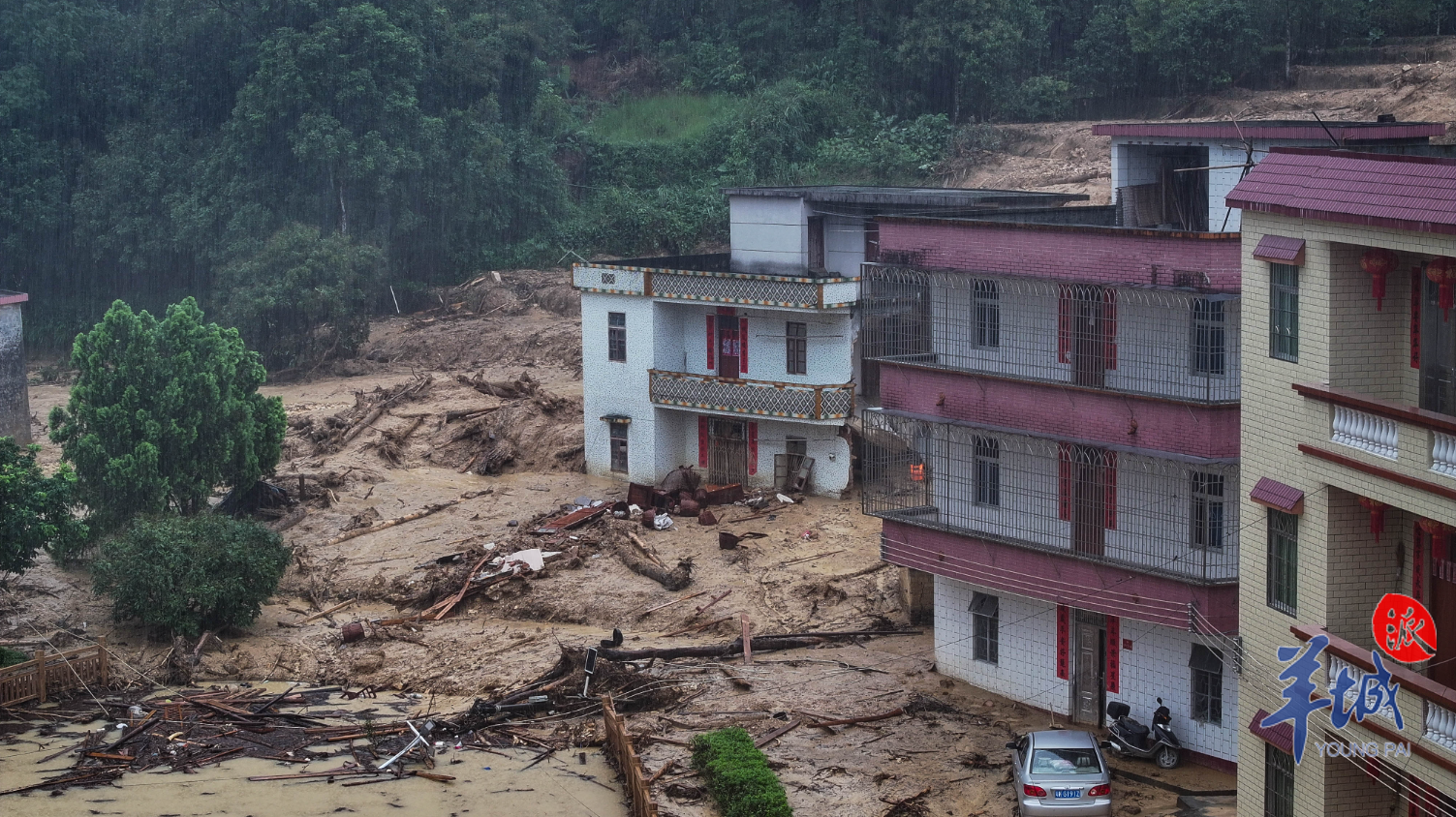6月17日,茂名信宜市贵子镇依旧雨势如注。在中和村联二自然村,泥泞的道路上还留着山体滑坡的狰狞痕迹——部分房屋砖瓦破碎、木门被泥浆掩埋。