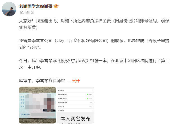 6月17日深夜,网友@老谢同学之你谢哥 发布微博,其自称“曾是李雪琴公司(北京十斤文化传媒有限公司)的股东”,实名举报该公司财务问题。