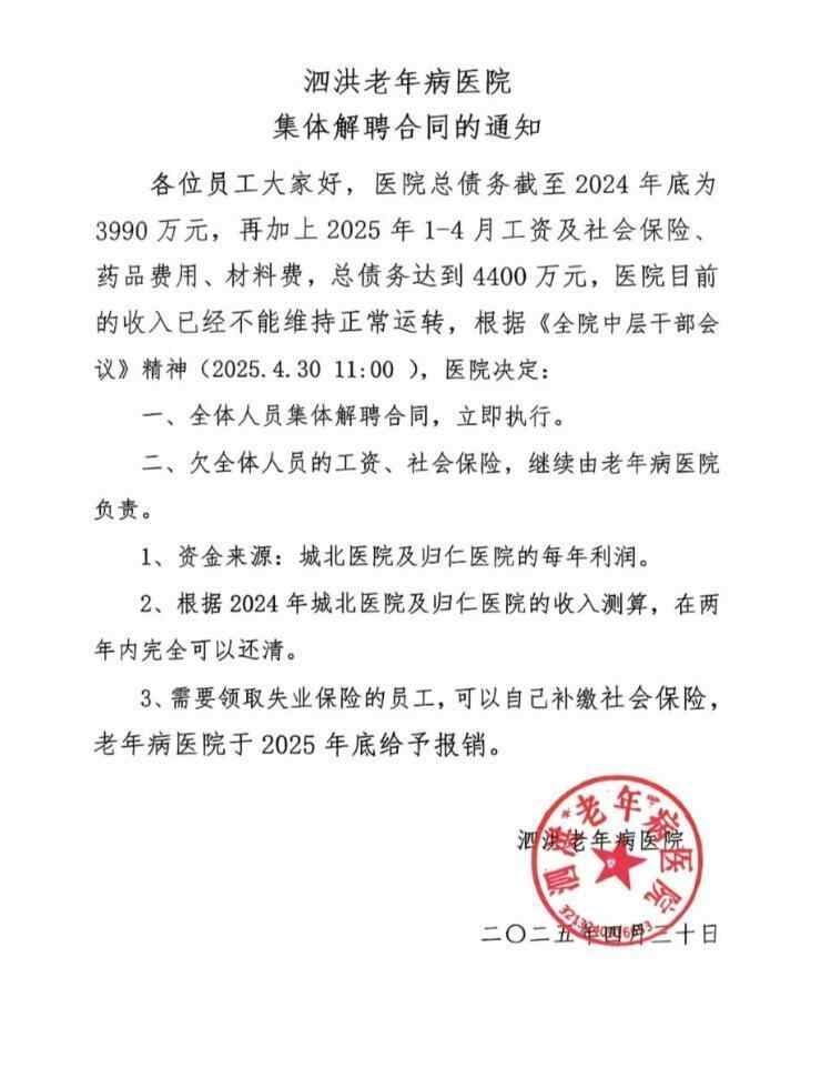 “总债务达到4400万元,医院目前的收入已经不能维持正常运转……全体人员集体解聘合同,立即执行。”连日来,这则署名为江苏泗洪老年病医院的通知在网上流传开来,引发关注。