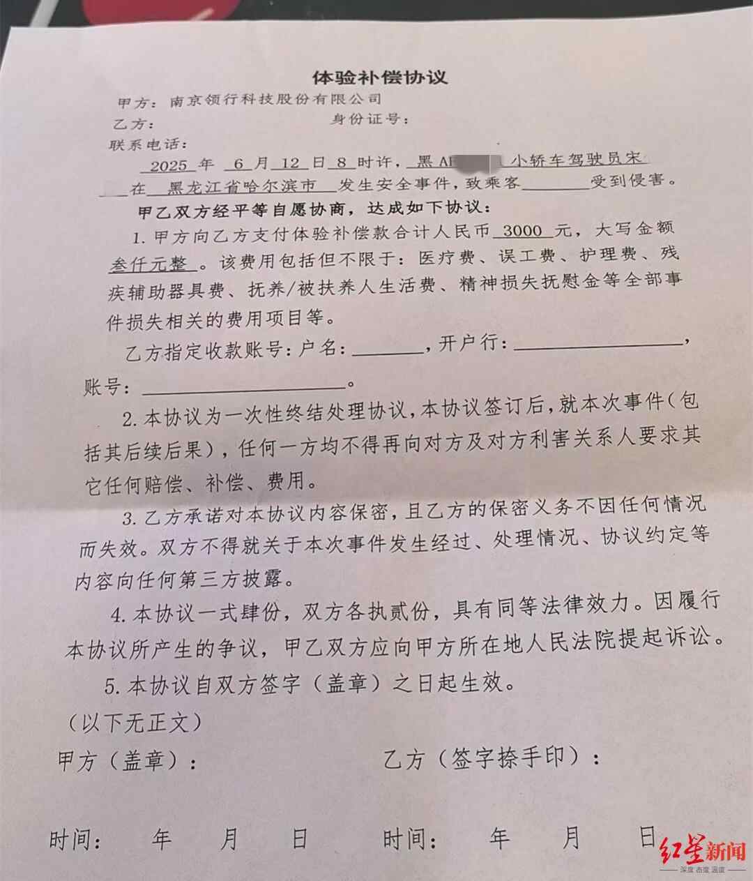 赵女士称,事发后她向T3出行平台投诉,平台将她两次打车的费用120元左右全部退给她,并表示愿意赔偿500元,被赵女士拒绝。“随后对方又称赔偿3000元,但是需要签署协议,内容是收到3000元后不得向任何第三方透露这个消息,也不得向加害者(网约车司机)索要任何经济赔偿。”赵女士认为这份协议侵犯了她的合法权益,没有签署。