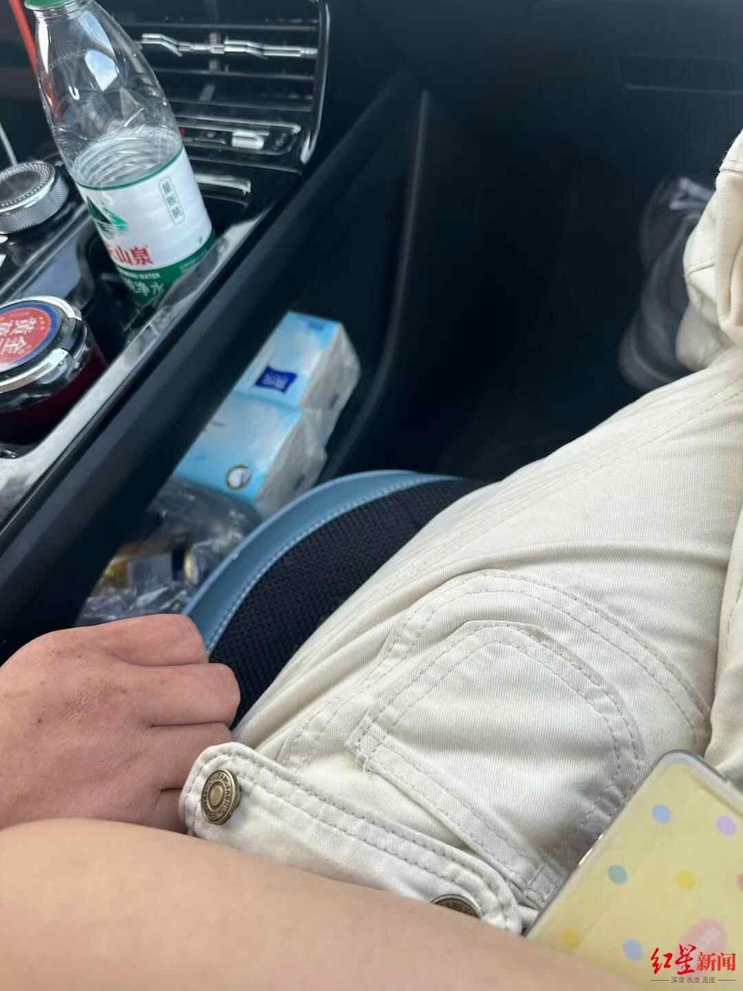 赵女士称,这名男司机在拔除完监控后,就一直把右手放到坐在副驾驶座的赵女士大腿位置。赵女士说,因为她平时坐车晕车,出发前要么会抽支烟,要么会吃点零食,因此当天上车前她在抽烟。男司机还假装递烟触碰赵女士胸部,甚至“还摸我的屁股”。赵女士用手机偷拍的动图显示:司机的手放到了副驾驶座位置,紧贴着乘客左侧大腿。