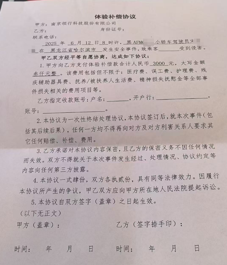 赵女士称,事发后她向T3出行平台投诉,平台将她两次打车的费用120元左右全部退给她,并表示愿意赔偿500元,被赵女士拒绝。“随后对方又称赔偿3000元,但是需要签署协议,内容是收到3000元后不得向任何第三方透露这个消息,也不得向加害者(网约车司机)索要任何经济赔偿。”赵女士认为这份协议侵犯了她的合法权益,没有签署。