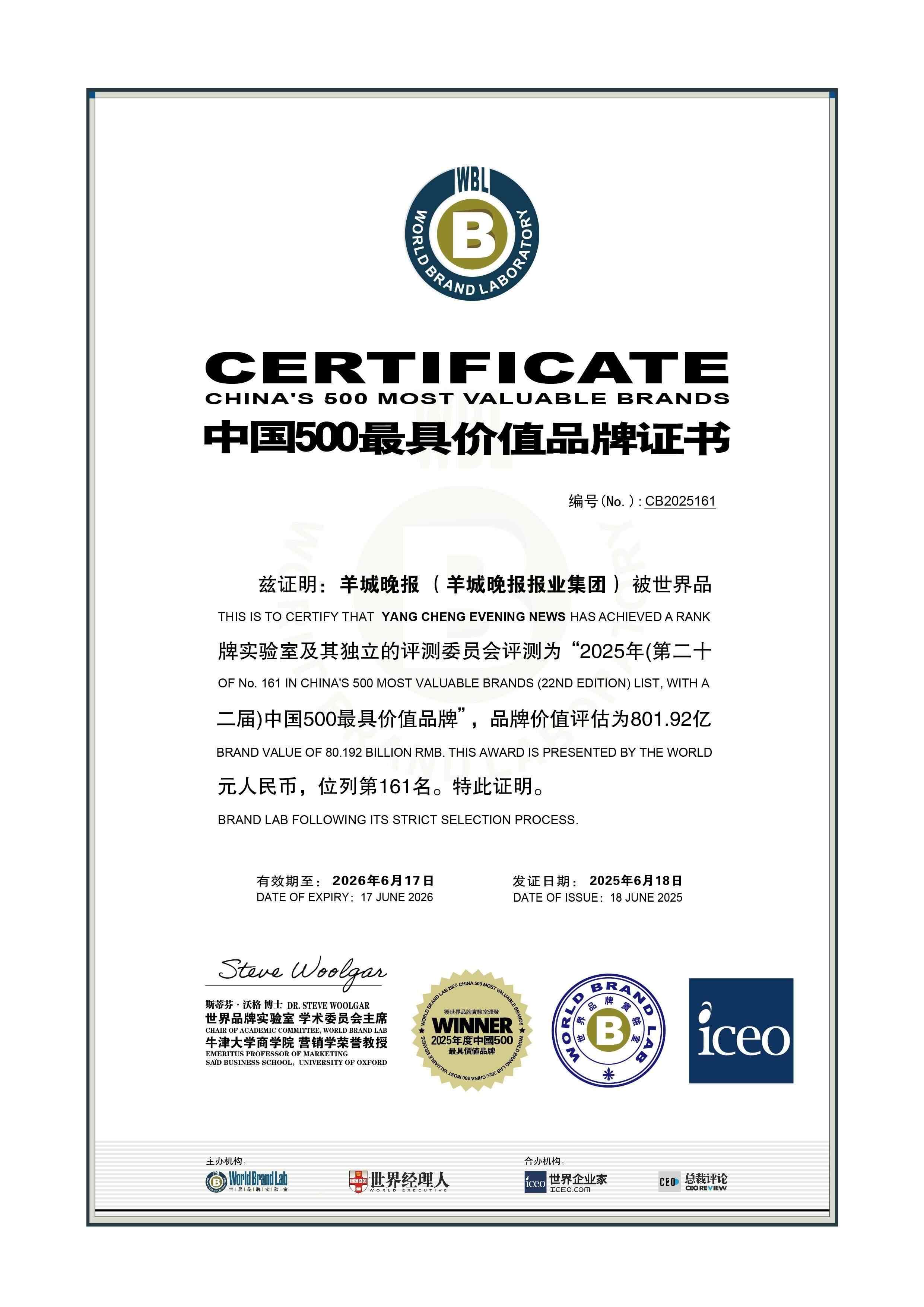 第22届世界品牌大会于6月18日在北京举行。世界品牌实验室发布了2025年《中国500最具价值品牌》分析报告。报告显示,《羊城晚报》品牌价值再创新高,达到801.92亿元,稳居全国晚报首位。