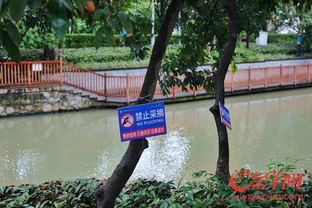 荔湾区公园管理中心表示,目前,荔枝湾涌每棵荔枝树都挂有提示牌——“禁止采摘,爬树危险,已施农药,后果自负”。此外,荔湾区公园管理中心也发动负责公园管理的工作人员、保安、绿化养护人员、保洁人员等加强巡查。部分荔枝果树附近有摄像头监控,如发现有人擅自摘取,会马上安排工作人员劝导。