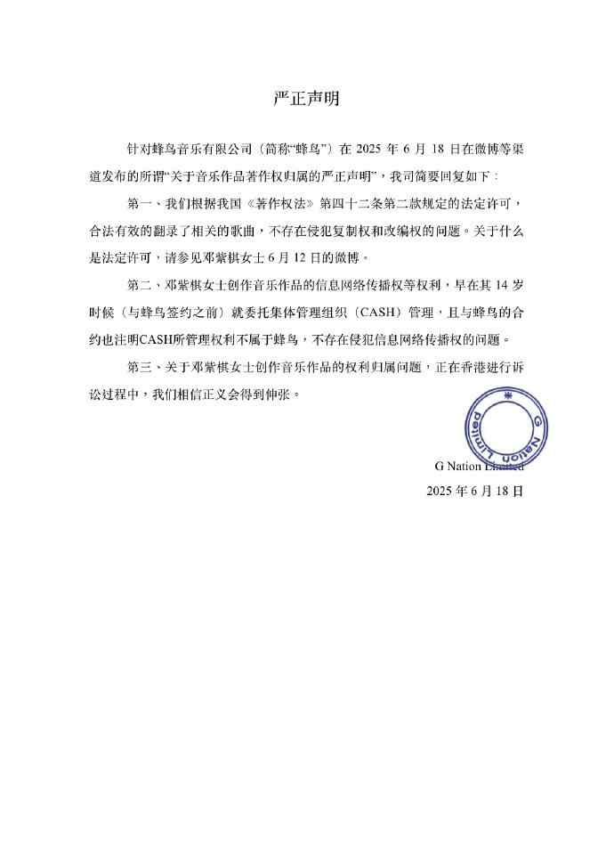 6月18日,邓紫棋前音乐公司蜂鸟音乐发声明称公司方享有录音制作者权、词曲著作权,且歌曲相关权利人明确为公司方,因此邓紫棋存在复制权改编权侵害、信息网络权侵害的行为,要求邓紫棋在48小时内删除侵权内容,各大平台立即下架重制歌曲,否则将依法采取行动。