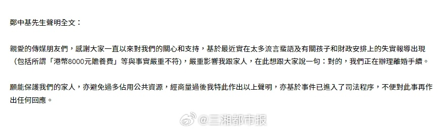 声明中,郑中基感谢大家的关心,称基于最近实在太多流言蜚语及有关孩子和财政安排上的失实报道出现,包括所谓的“港币8000元赡养费”等与事实严重不符,严重影响我及家人,在此想跟大家说一句:“对的,我们正在办理离婚手续”。