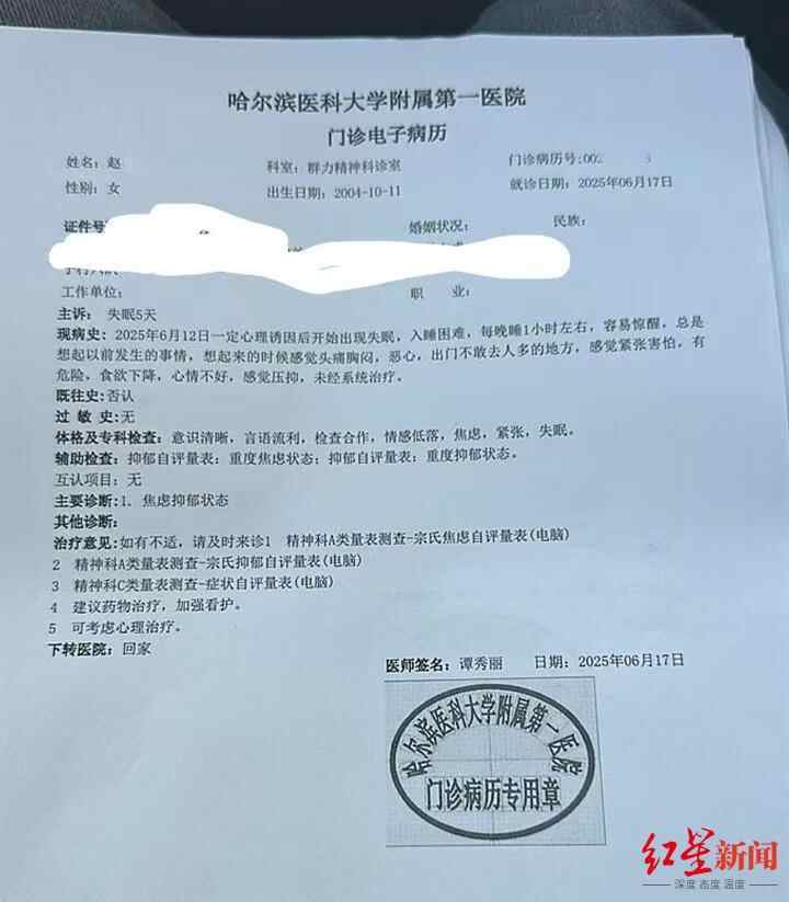 “对我影响太大了,我连续5天无法入睡。”6月17日,赵女士前往哈尔滨医科大学附属第一医院群力精神科诊室就诊,“体格及专科检查”显示其意识清晰,言语流利,检查合作,情感低落,焦虑,紧张,失眠。“辅助检查抑郁自评量表”显示其重度焦虑状态;重度抑郁状态。主要诊断结论为:焦虑抑郁状态。医生建议:药物治疗,加强看护,可考虑心理治疗。
