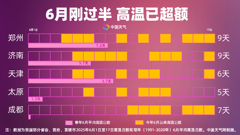 大城市中,不少地方已经超额完成了常年6月平均高温日数“KPI”。根据中国天气网统计,截至6月17日,郑州、济南6月以来高温日数已达9天,常年6月它们的平均高温日数分别是7.2天和5.7天。成都常年6月平均高温日数仅有0.2天,而今年截至17日已经达到7天,提前锁定了当地气象观测史上高温日数最多的6月。