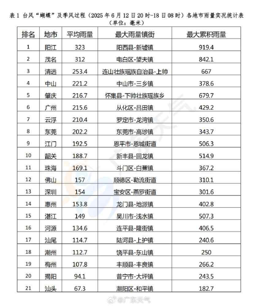 广东省气象部门统计,从12日20时至18日8时,全省平均雨量183.5毫米,阳江阳西县新墟镇出现过程最大累积雨量919.4毫米。此外,广东有19个地市的254个镇街出现了1小时雨量超50毫米的短时强降水,其中阳江、茂名、中山、珠海等4个地市的15个镇街1小时雨量超100毫米,阳江阳西县程村镇录得最大1小时雨量142.6毫米。