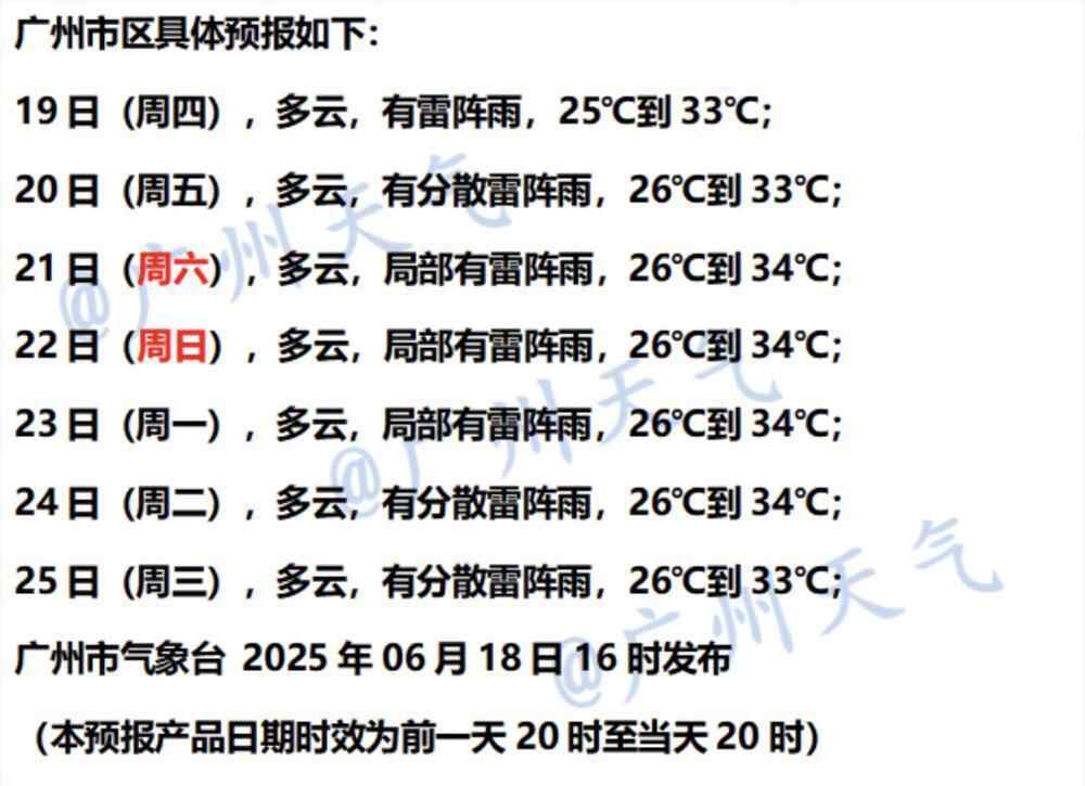 广州市气象台18日预计,随着副热带高压加强控制,未来几天广州降雨减弱,渐转多云天气为主,间中有雷雨,高温炎热渐显。预计21日至24日,广州市区最高气温将可达到34℃。展望25日起,广州可能受高空槽移近影响,雷雨再趋明显。