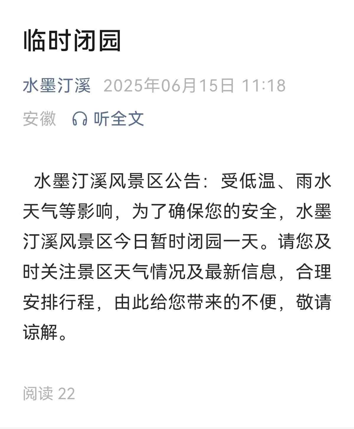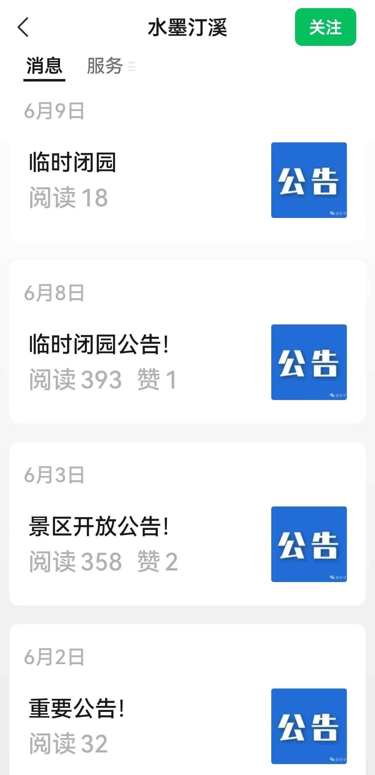 记者查询上述事发景区的微信服务号发现,6月以来,该景区已经多次因“雨水天气”等影响而发布闭园公告,其中事发前一天(6月15日)也曾发布“临时闭园”公告。