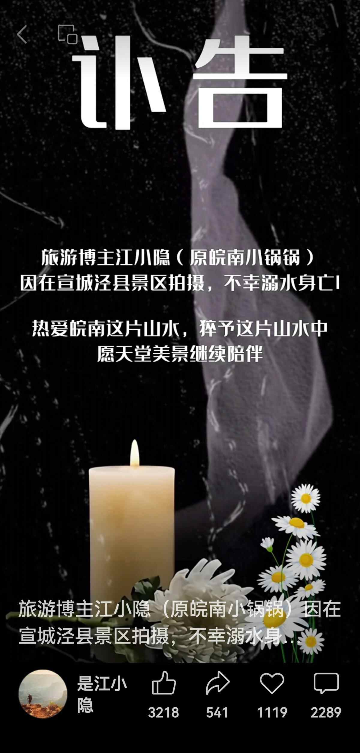 2025年6月17日,旅游博主江小隐的账号由亲友代为发布讣告,确认江小隐于6月16日在安徽宣城泾县水墨汀溪景区拍摄时不幸溺水身亡。