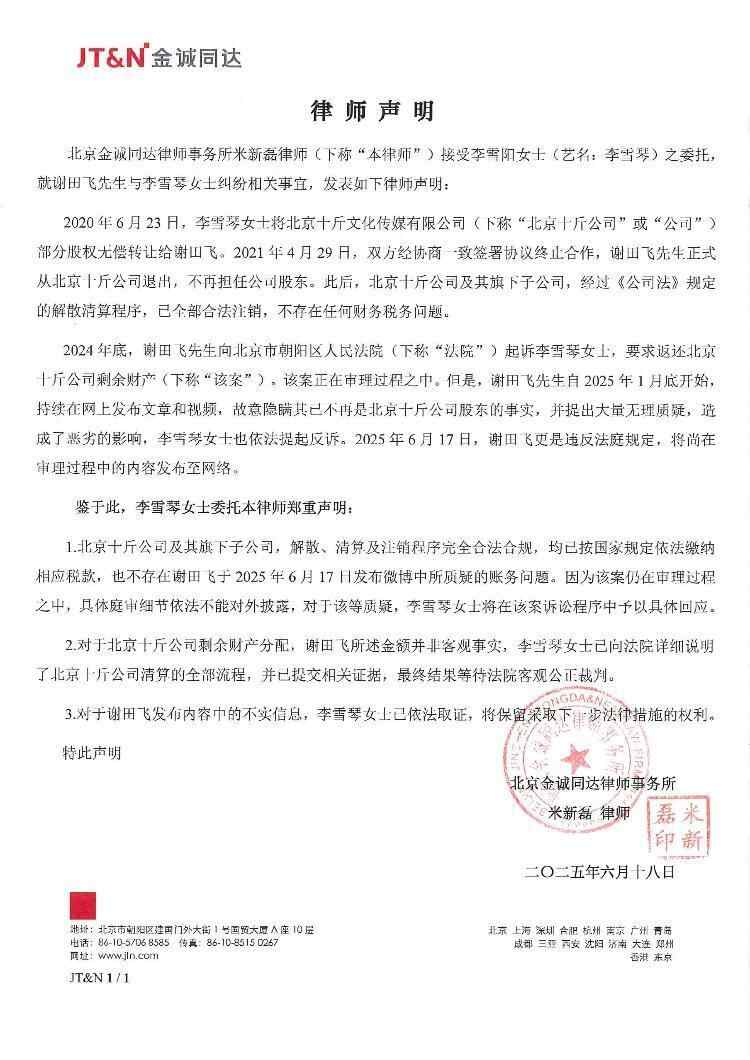 随后,“李雪琴 老谢”“网友实名举报李雪琴公司财务问题”迅速登上微博热搜。相关新闻发酵仅半日,李雪琴工作室一纸声明回应,并表示“法院见”。