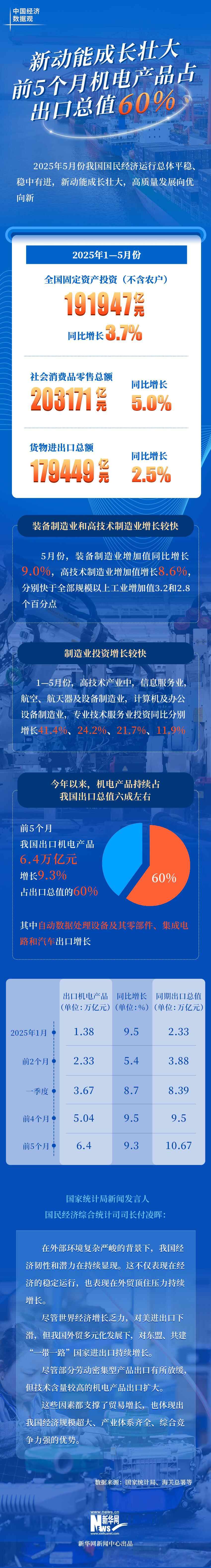 中国经济数据观|新动能成长壮大 前5个月机电产品占出口总值60%