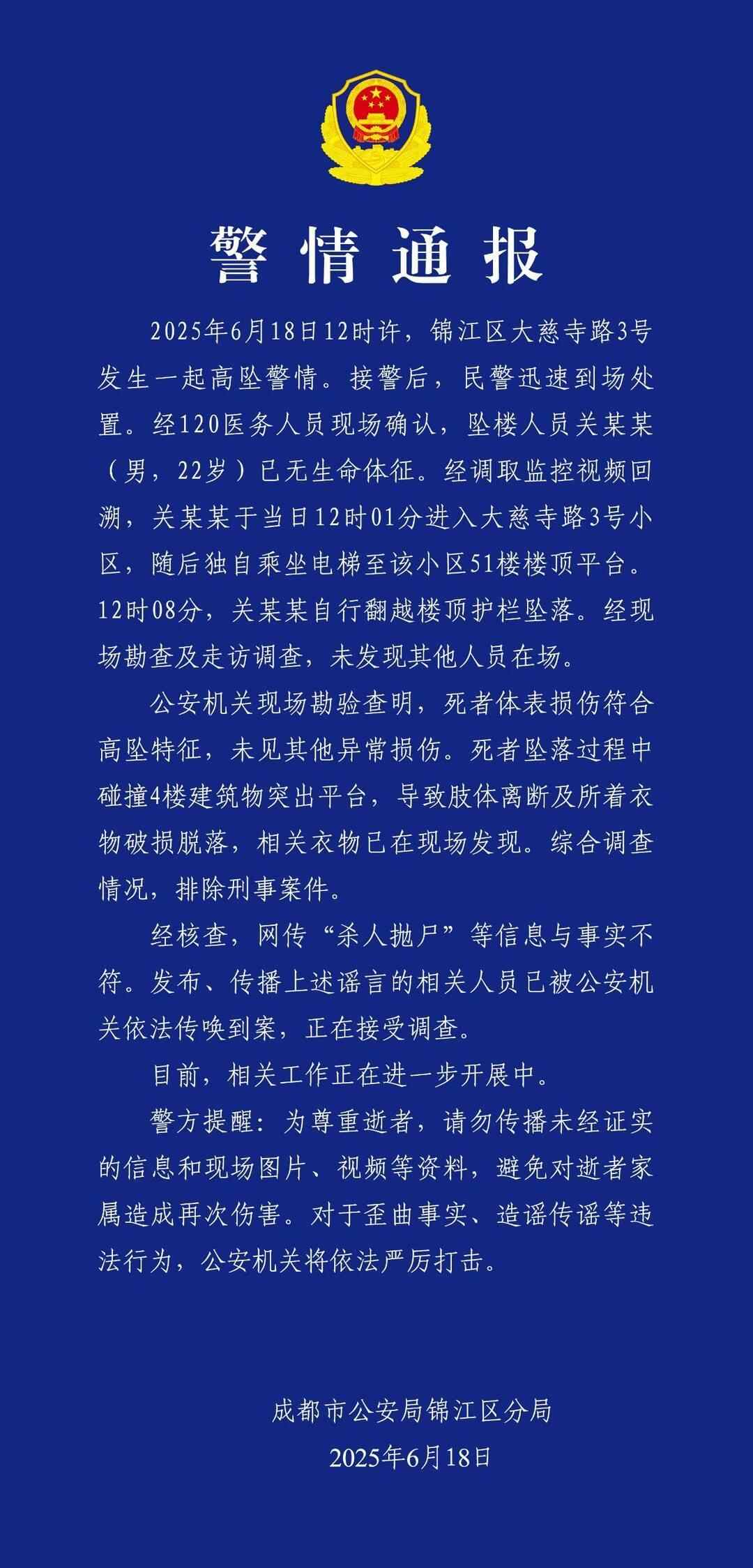 2025年6月18日12时许,锦江区大慈寺路3号发生一起高坠警情。接警后,民警迅速到场处置。经120医务人员现场确认,坠楼人员关某某(男,22岁)已无生命体征。