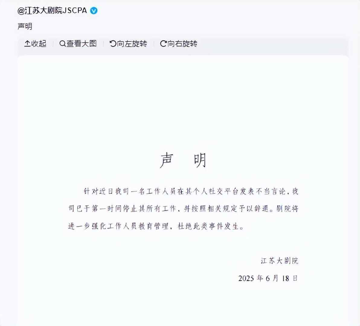 针对近日我司一名工作人员在其个人社交平台发表不当言论,我司已于第一时间停止其所有工作,并按照相关规定予以辞退。剧院将进一步强化工作人员教育管理,杜绝此类事件发生。