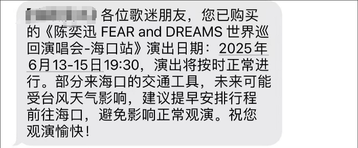 有观众透露,12日下午六点仍然收到了演出正常举行的通知短信,有部分观看13日演唱会的观众已经通过各种方式前往了海口,对此有部分观众表示强烈不满。