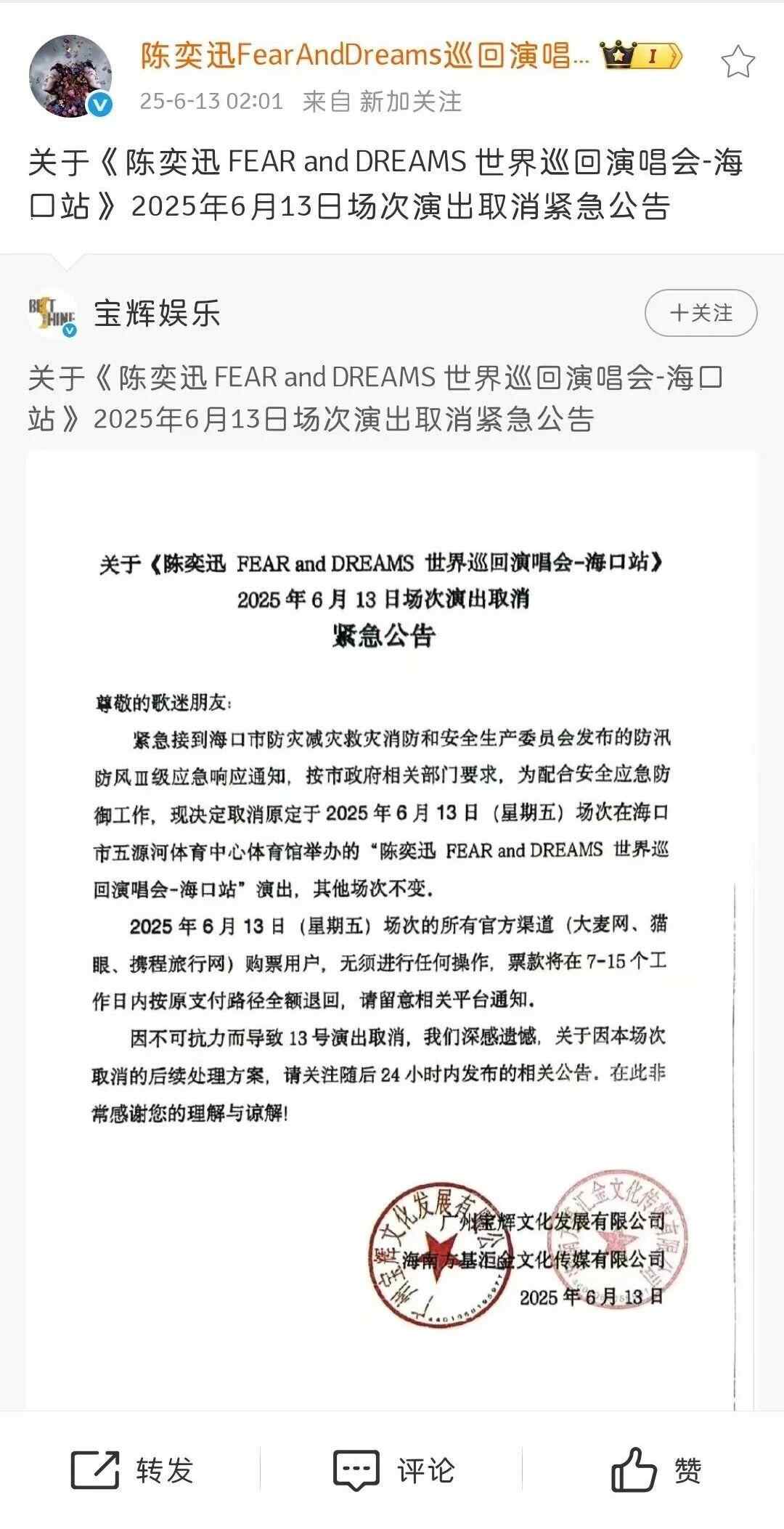 6月13日凌晨,宝辉娱乐发布关于《陈奕迅 FEAR and DREAMS 世界巡回演唱会-海口站》 2025年6月13日场次演出取消紧急公告 :
