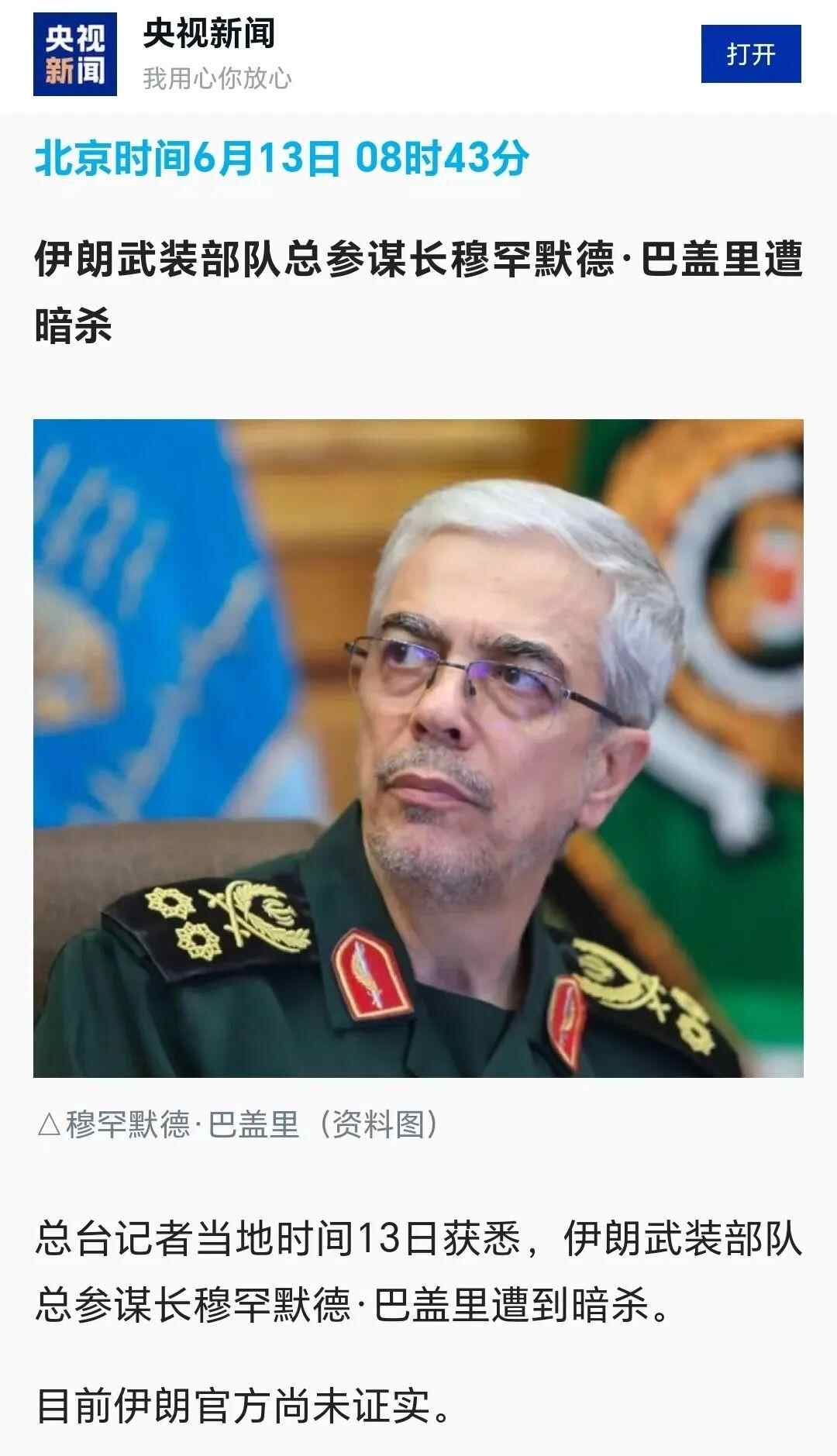 据央视新闻消息,总台记者当地时间13日获悉,伊朗武装部队总参谋长穆罕默德·巴盖里遭到暗杀。