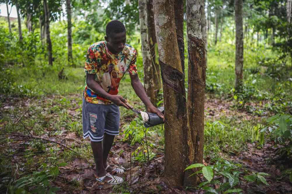 2025年5月30日,橡胶种植户在科特迪瓦圣佩德罗省大贝雷比镇收割橡胶。新华社记者 王冠森 摄