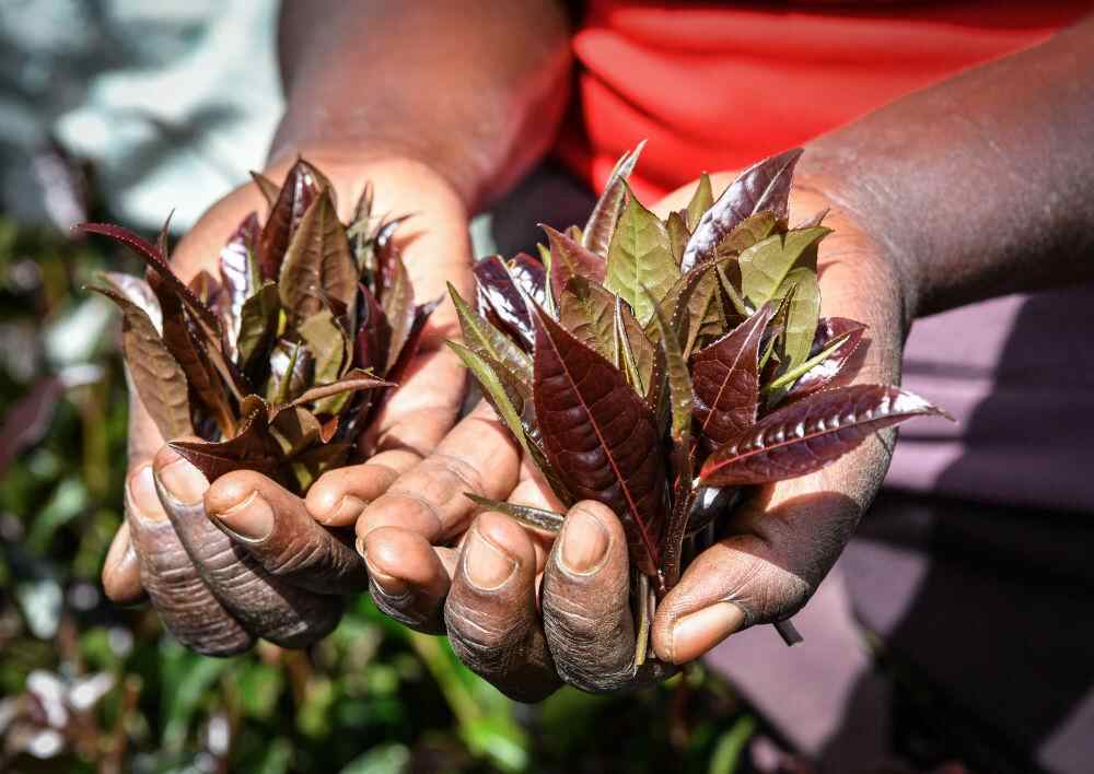 2024年5月6日,在肯尼亚穆拉雅郡的一处紫茶园,茶农展示采摘下来的紫茶。新华社记者 韩旭 摄