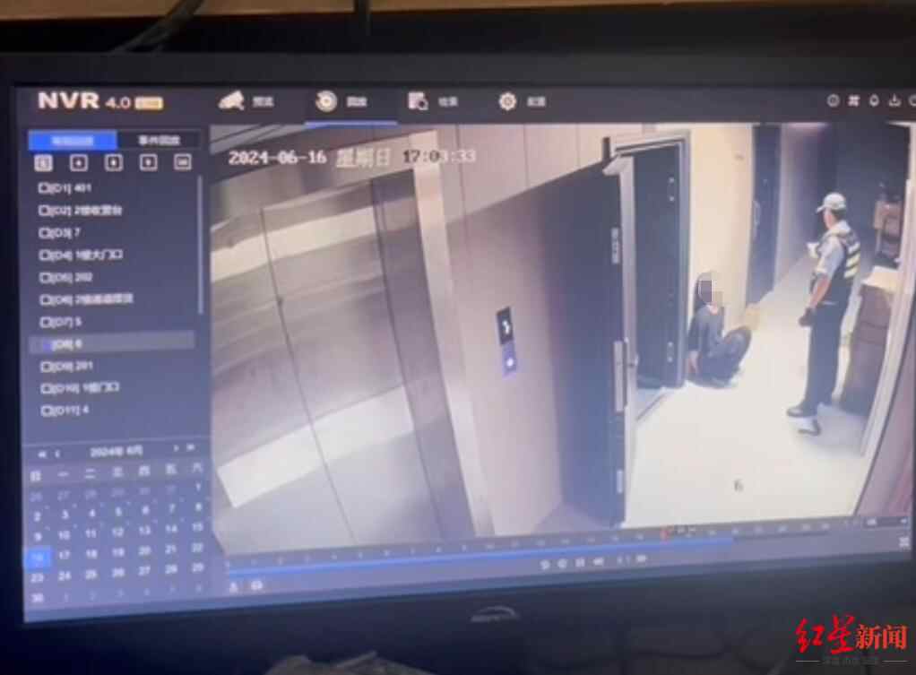 事发公寓的楼道监控视频显示,2024年6月16日17时,电梯门打开,几名民警走出电梯走到右侧的公寓门口,一名民警正在打电话,随后张某打开房门走到门边的通道抽烟。民警进入李莉的公寓后,又出来将张某的手拷上,张某一动不动背靠墙仰着头蹲着,接受民警的问询。